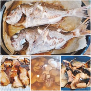 ☆鯛の塩焼き☆ブリの塩焼き☆鯖の味噌煮☆蛤のお吸い物☆玄米入りご飯☆南瓜の煮物☆小松菜と人参のおかか和え☆りんご