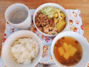 【完了期】☆白米☆なめこと豆腐の味噌汁☆豚肉の生姜焼き☆高野豆腐の煮物☆マカロニサラダ☆キュウイフルーツ