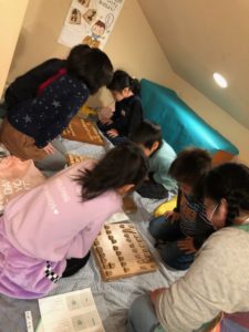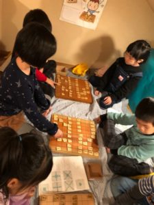 今日は駒の動きをおさらいし、短い時間でしたが対戦をしてみました。駒を進めるのに戸惑った時は、皆で教え合いながら、自分たちの力で対戦をたのしんでいました。駒の動きをおさらいしています。礼に始まり礼に終わります。