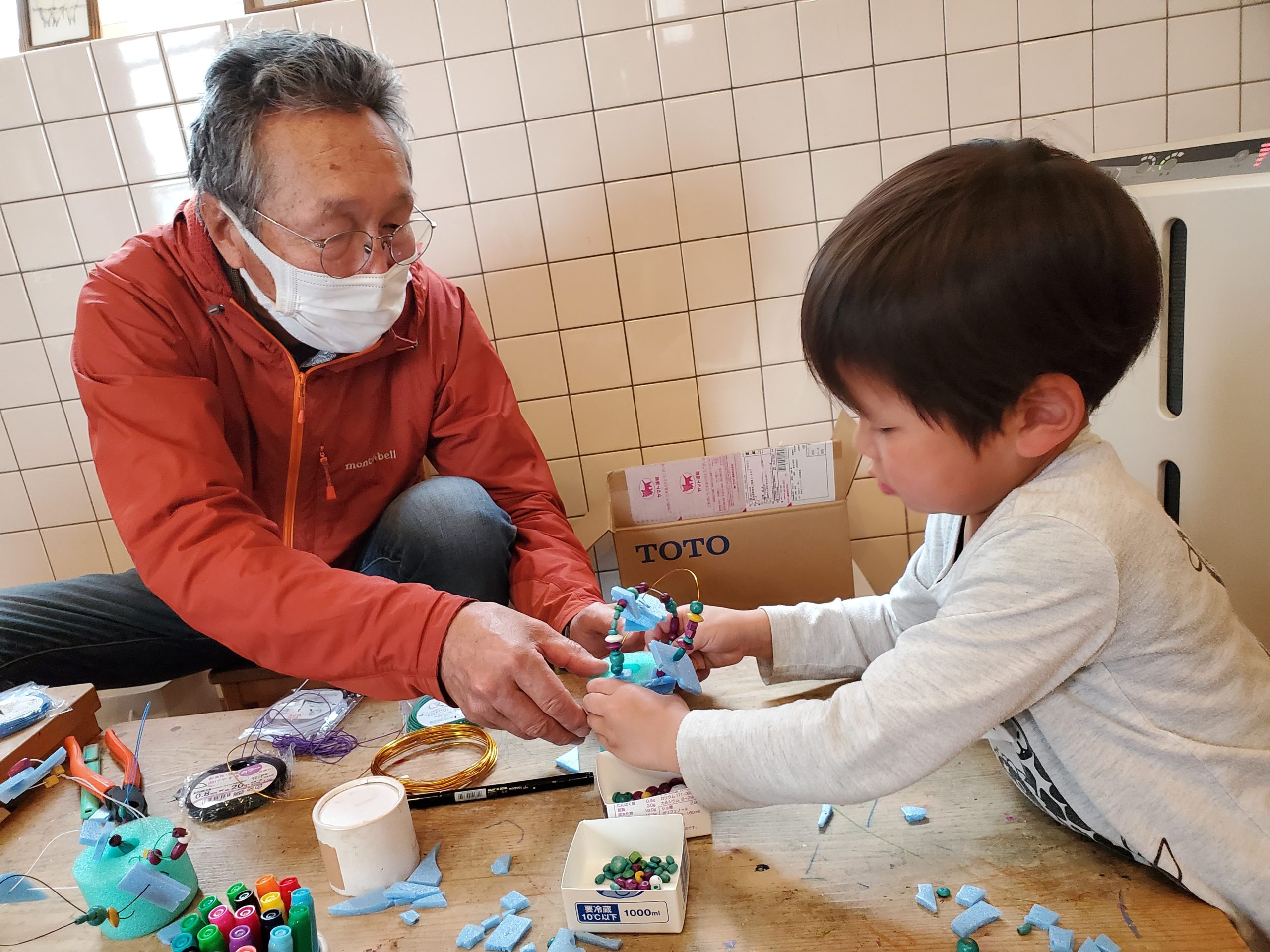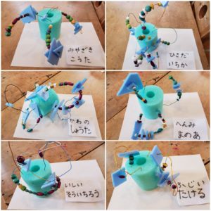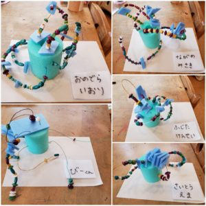 今日は針金にビーズやスポンジパネルを通し自由に形作る事を楽しみました。ただ通すだけだとビーズがこぼれてしまうので針金の先を曲げておくといい事やしっかりと形作る方法などを教えて頂きながら、それぞれの感性が光る作品に仕上げていました。