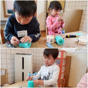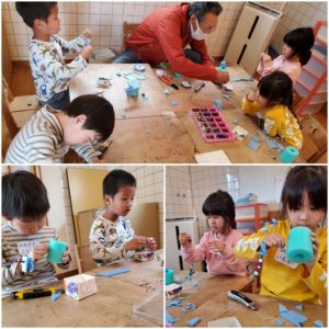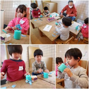 少しづつ形になってくると「ハートに見えるよ♡」「ゾウさんだよ」とイメージを膨らませていました♪