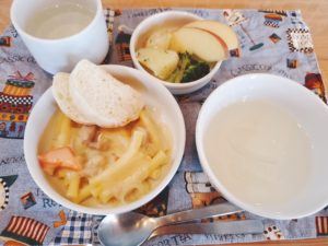 【完了期】☆マカロニグラタン☆白パン☆オニオンスープ☆青のりポテト☆ブロッコリー☆りんご
