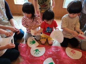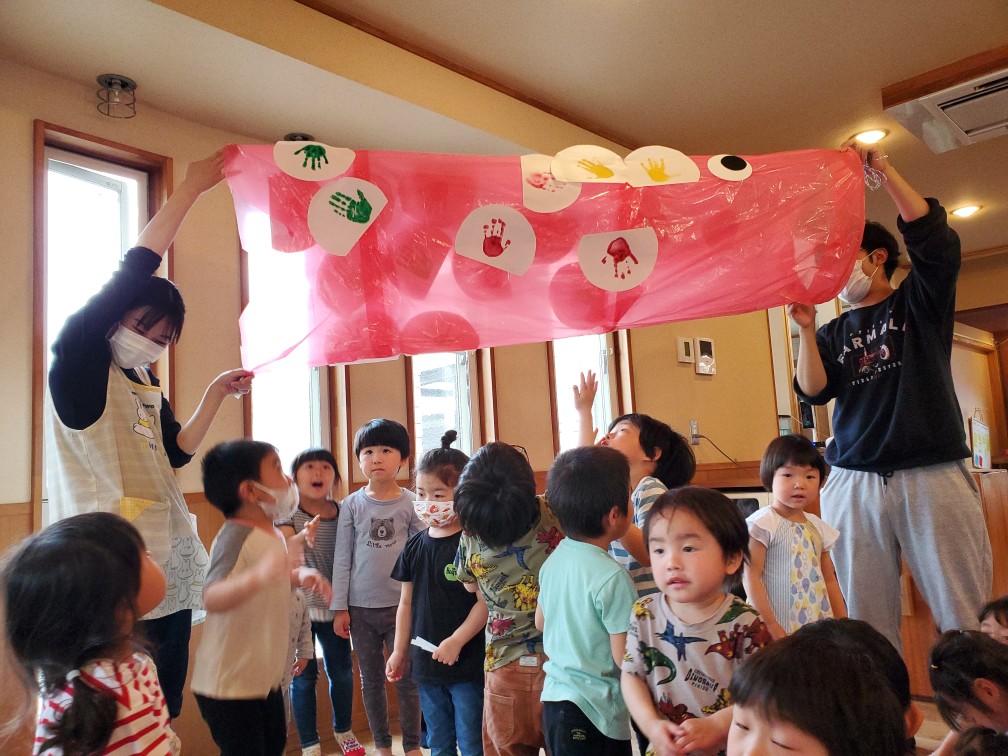 こどもの日を前にどんぐりではこいのぼり作りをしました♪大きいお兄ちゃんお姉ちゃん達が小さい子達にも教えてくれたり手伝ったりしてくれながら子ども達みんなで取り組みました。 みんなの可愛い手形が鯉のうろことなり世界に一つだけのこいのぼりが完成!大空を力強く泳いでくれたらいいなぁ~☆