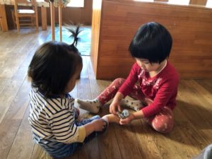 朝の集いで”お庭で過ごす!”と子どもたちと相談をし、お庭に行く準備をしているとお姉さんが手伝ってくれていました😊