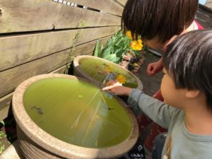 お庭の睡蓮鉢になにか黒いものが浮かんでいるな、、、と子どもたちが気づきよーく見てみると