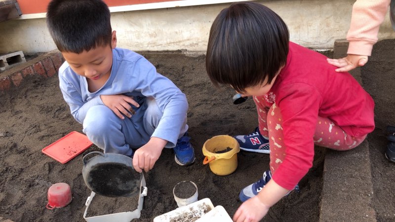 お庭に出た後は、昨日の雨で湿った砂で泥遊びをしていました。