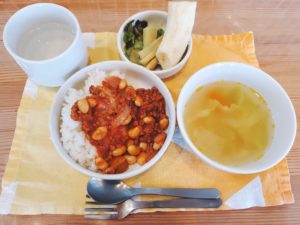 ☆ポークビーンズ☆玄米入りご飯☆レタスのりサラダ☆具沢山コンソメスープ☆スティックさつま芋☆バナナチップス