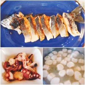 ☆マスのバターソテー☆茹でタコのバター炒め☆生青のりとお麩の味噌汁