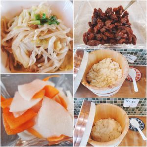 ☆もやしと春キャベツの炒め物☆大根と人参の浅漬け☆玄米入りご飯☆白米☆レーズン