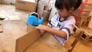 今日のテーマは様々な形に切ってある段ボールをセロハンテープを使って繋げ、立体的に組み立てる事をしました。