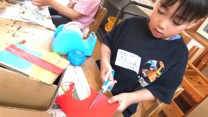 組み立てた後、キラキラテープや好きな形に切った折り紙を自分で長さを調節しながらハサミで切り、組み立てた物にのりで貼ったりデザインしていきます。