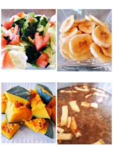 ☆レタスとわかめのサラダ☆蒸かし南瓜☆バナナチップス☆もずくの味噌汁