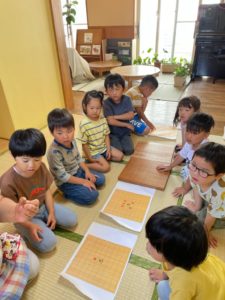 『桂馬』はお馬の足が、、、、って四つついてる駒だよ。と伝えると沢山の駒の中から「あった!これかな⁈」と見つけ出していました。年長さんに助けてもらいながらみんな自分で駒を並べることが出来ました👏