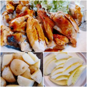 ☆照り焼きチキン☆蒸かしじゃが芋☆青りんご