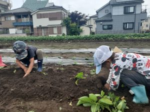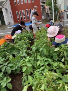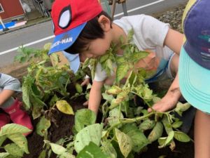 植えてから毎日、晴れの日も雨の日も風の日もじゃが芋の成長を見守り、必要になれば去年の経験を生かして今の年長の子たちが年中の子たちに”追肥” ”泥寄せ”を教えてくれて一緒にしたり今日までに色んなことがありました。