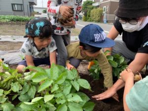今まで育ててきたじゃが芋を収穫する子どもたち。