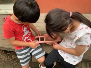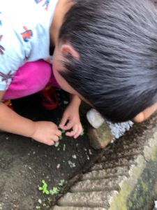 梅雨の時期、ジメジメしている所に虫がいる事をよく知っている子どもたち。隅っこを探したり石をどけてみたり