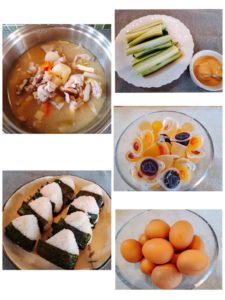 ☆豚汁☆コロコロおにぎり☆☆野菜スティック(胡瓜)☆ゼリー☆茹で卵