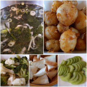 ☆わかめと長ねぎのスープ☆じゃが芋の甘みそ炒め☆ブロッコリーとカリフラワー☆パン☆キウイフルーツ