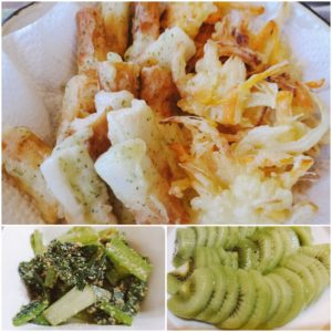 ☆新玉葱と人参コーンのかき揚げ☆竹輪の磯辺揚げ☆小松菜の胡麻和え☆キウイフルーツ