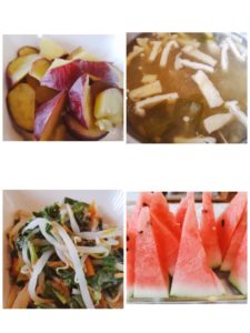 ☆さつま芋の甘煮☆えのきわかめの味噌汁☆モロヘイヤのおかか和え☆スイカ