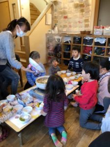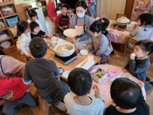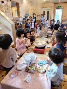 今日のランチは鍋パーティー。 大きい子のプロジェクトチームに小さい子達も混ぜてもらい、チームごとに鍋を囲み楽しみました。朝の集いで今日の鍋パーティーに使う卓上コンロとお鍋を紹介しました。そして、何に気を付けたらいいかを皆で確認したところ、大きい子から沢山の意見が出て、それを小さい子達はよく聞いていました。コトコトコト…という音と共に蒸気口から湯気が出始めると「わぁ!湯気が出てきたよ」と出来上がりを楽しみにする子ども達。そして蓋を開けた瞬間、ふわぁっと立ち昇る湯気にみんなの歓声が響き渡りました。出来立てのお鍋をフーフーしながら「おいしいね」と食べる子ども達でした。