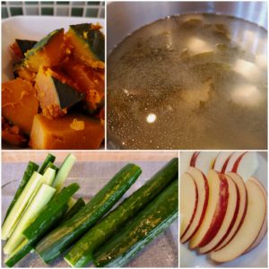 ☆豆腐とわかめのスープ☆南瓜の煮物☆キュウリスティック☆りんご
