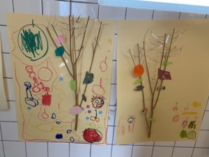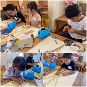 葉っぱの形や自分のイメージした形に切った折り紙を貼り付ける時に両面テープを使いました。苦戦していた子もいましたが最後まで諦めずにやり切り作品を完成させていました!〝粘り強いなぁ~〟と先生に褒めて頂き嬉しそうな子ども達・・・😊