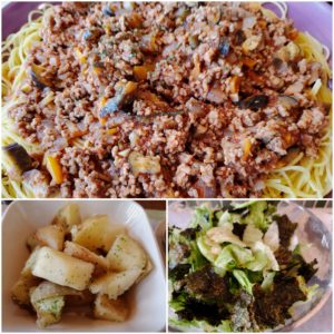 ☆茄子のミートソーススパゲティ☆のりじゃが芋☆レタスのりサラダ