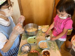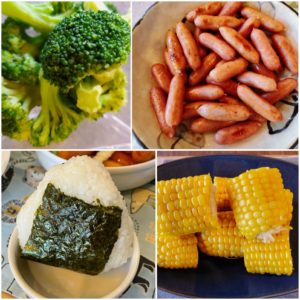☆茹でブロッコリー☆ウィンナー☆おにぎり(ツナマヨ、おかか、塩)☆茹でとうもろこし