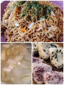 ☆焼きそば☆ズッキーニと玉葱のスープ☆二色おにぎり(ワカメ、ゆかり)