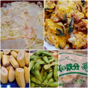 ☆ひやむぎ☆夏野菜と竹輪のかき揚げ☆枝豆☆チーズ☆ポリポリ小魚☆バナナ