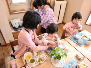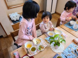 ランチの時に0歳児と年長さんが隣同士の席になりました。枝豆を食べたいけれど どうしてもむけない0歳児 そんな姿をやさしく見守る年長さん 女の子は隣のお姉さんに「やって」とお願いしました。お姉さんは、何も言わずに枝豆をむいてあげました。“ありがとう……”