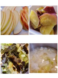 ☆りんご☆蒸かしさつま芋☆レタスのりサラダ☆コーンキャベツのスープ