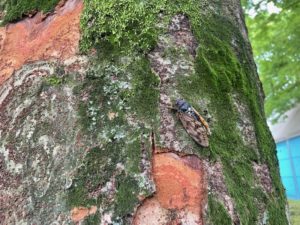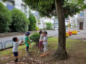 子ども達は夢中でセミ探しをしています。大きな木を見上げたり垣根の間まで目を凝らしながらそれはもう必死です!大人も探してみますがこんな風に木の模様に紛れ込んでいたら全く気が付きません💦 それでも子ども達は「いたぁー!」と素早く捕まえてしまいますΣ(・□・;)少しづつ秋の気配が感じられる今日この頃ですが、まだまだ子ども達の暑い夏は終わらないようです👍