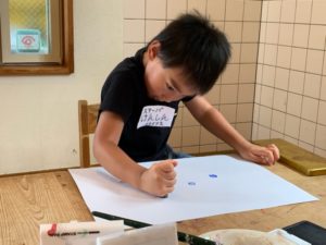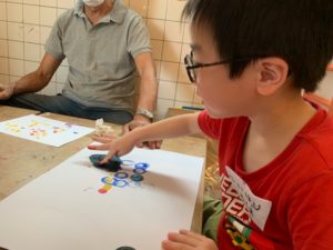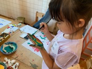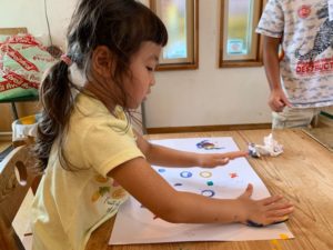 今日の年中さんのアトリエの日は、〇△□の形や手指で絵の具スタンプを楽しみました😊いくつかの絵の具を用意し好きな色でスタンプをするのですが、色を変える時は絵の具をキレイに拭き取らないと色が混ざりくすんだ色になってきてしまう事を学んだ子ども達です。色とりどりの模様からイメージを膨らませて楽しんでいました♪