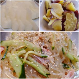 〇春雨サラダ〇蒸かしさつま芋〇梨