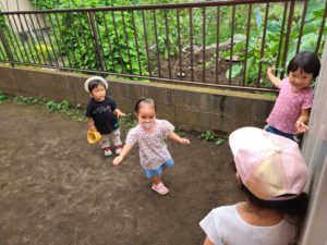 「だ~るまさんがこ~ろんだ!」とお姉ちゃん達が一緒に遊んでくれて楽しそうな声が響いていました♬