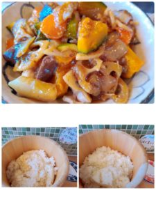 ☆根菜と鶏肉の甘酢炒め☆玄米入りご飯☆白米