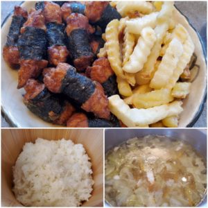 ☆ご飯☆エリンギと野菜のスープ☆のり巻きチキン☆ポテトフライ