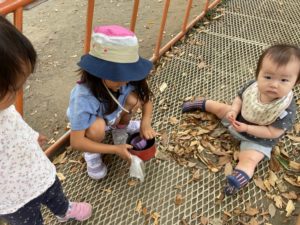 朝晩はだいぶ涼しくなり長袖姿で登園してくるお友達も増えてきました。公園に出かけると片隅には落ち葉の山が…それを見つけた1歳児の男の子👦落ち葉の上を踏み歩いたり両手に抱えて投げてみたり🍂彡 サクサク♪ カサカサ♪ 落ち葉の音や感触を楽しんでいました😊 また秋を探しに行こう!