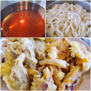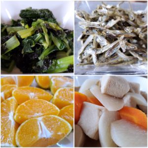 ☆あったかうどん☆さつま芋南瓜のかき揚げ☆小松菜の海苔和え☆小魚☆高野豆腐の煮物☆みかん