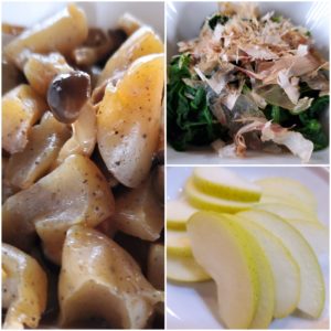 ☆ほうれん草のお浸し☆蒟蒻ときのこの炒め物☆りんご