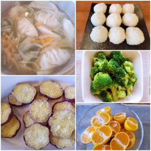 ☆餃子スープ☆塩おにぎり(鮭おにぎりも出しました♪)☆さつま芋のチーズ焼き☆茹でブロッコリー☆みかん