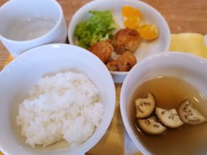 ☆軟飯☆茄子の味噌汁☆鶏ひきと蓮根ふわふわ揚げ☆レタスのりサラダ☆みかん