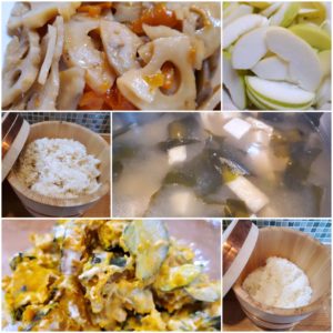 ☆玄米入りご飯/白米☆豆腐とわかめの味噌汁☆蓮根と人参のきんぴら☆南瓜と胡瓜のサラダ☆りんご