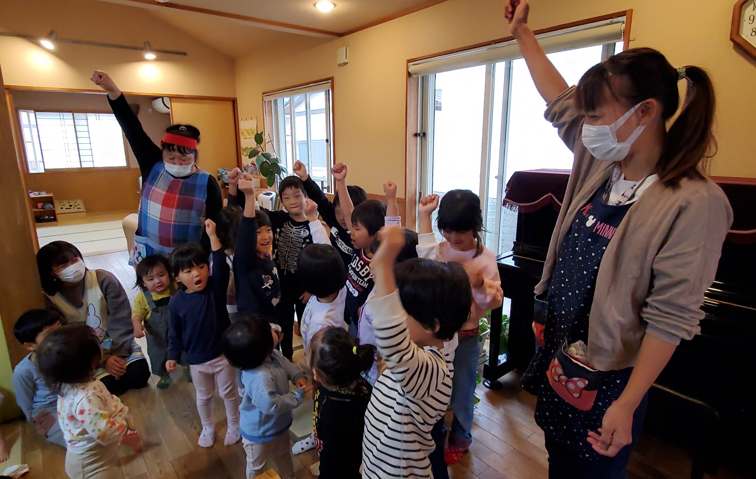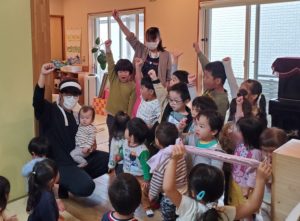 今日はフレフレふれんでぃに向けてあか組しろ組のチーム発表がありました!大きい子から順に名前が呼ばれると元気に返事をして前に並ぶ子ども達。各チームの応援団長(年長さん)がチームを引っ張っていきます!そして周りの大きい子達が団長を支えていきます‼「あか組絶対勝つぞ~!」「オーッ‼」