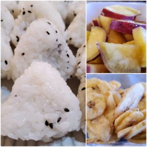 ☆ごま塩おにぎり☆さつま芋のレモン煮☆バナナチップ