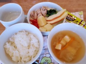 【後期】☆軟飯☆キャベツと豆腐の味噌汁☆鶏肉のやわらか煮☆小松菜の胡麻和え☆蒸かしじゃが芋☆ミニトマト☆りんご