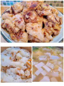 ☆秋の根菜炊き込みご飯☆チキンソテー☆豆腐と白菜の味噌汁